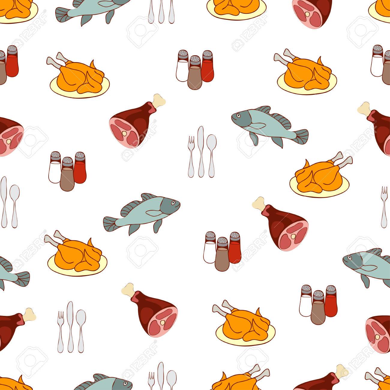 Food Background Meat And Fish Drawn Cartoon Multicolored