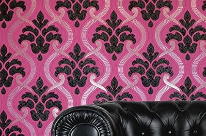 Damask Glitter Wallpaper Modern Pattern Pink Black Silver Textured